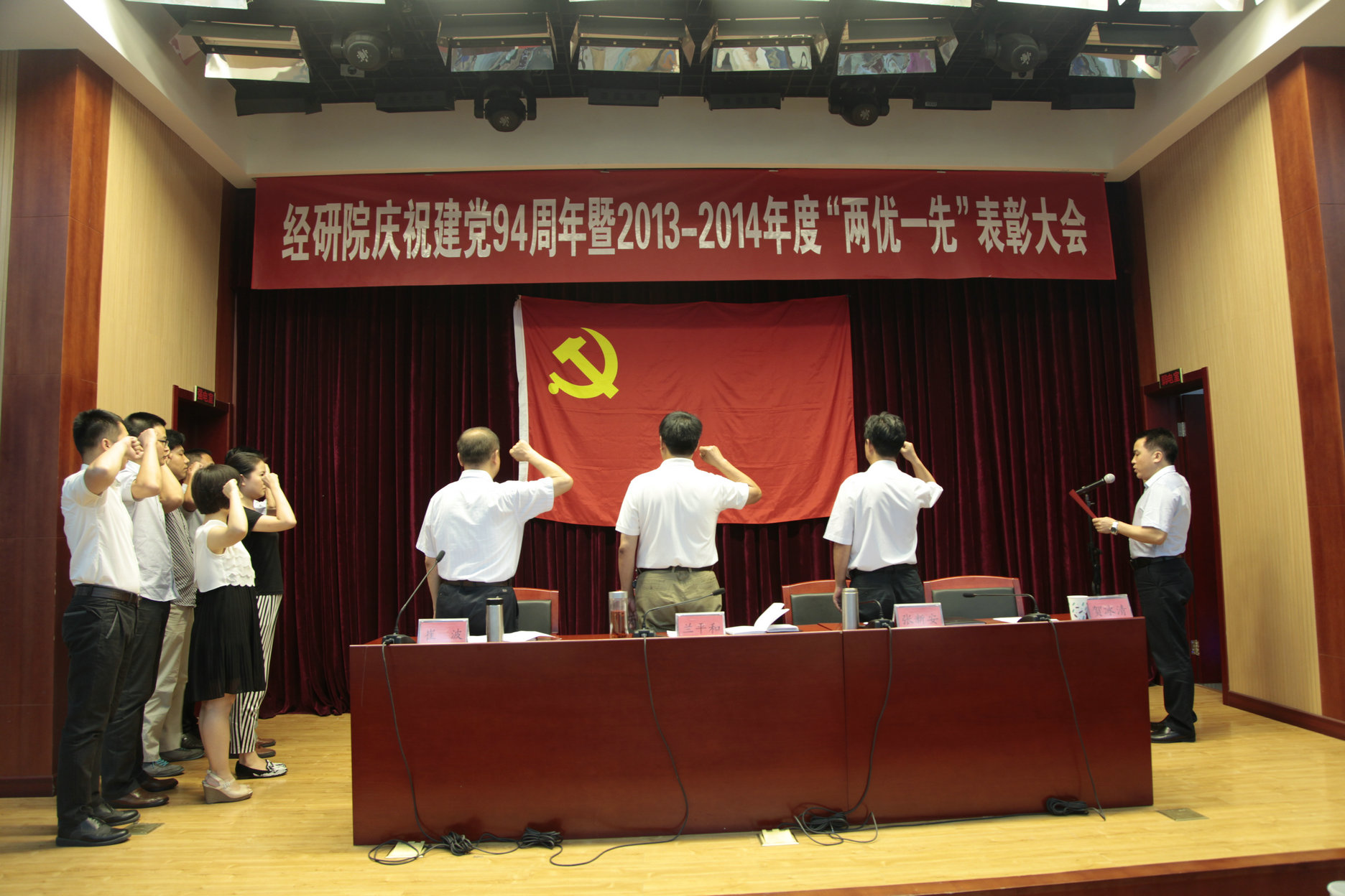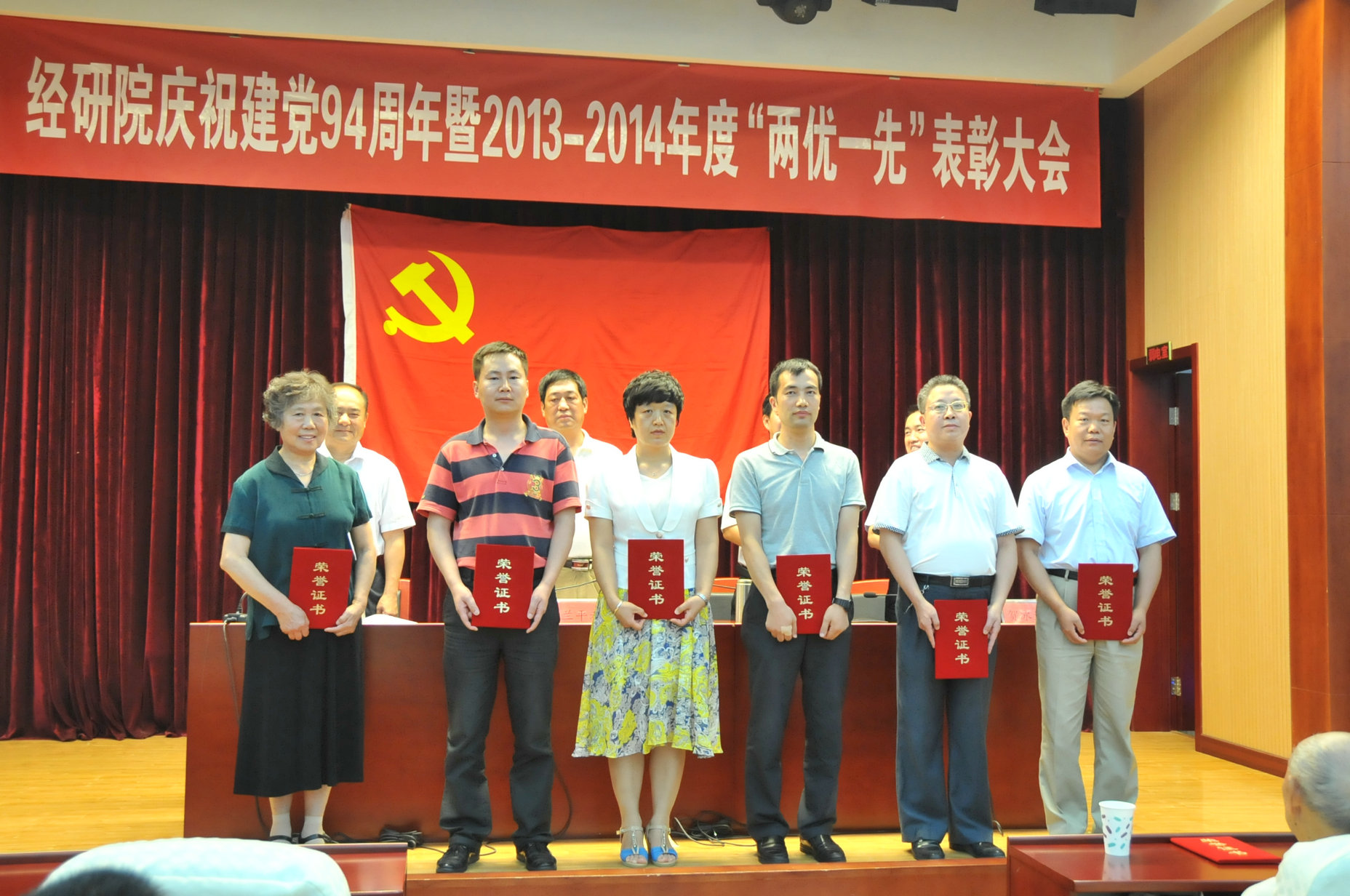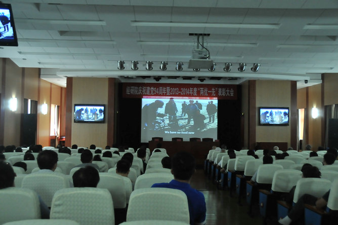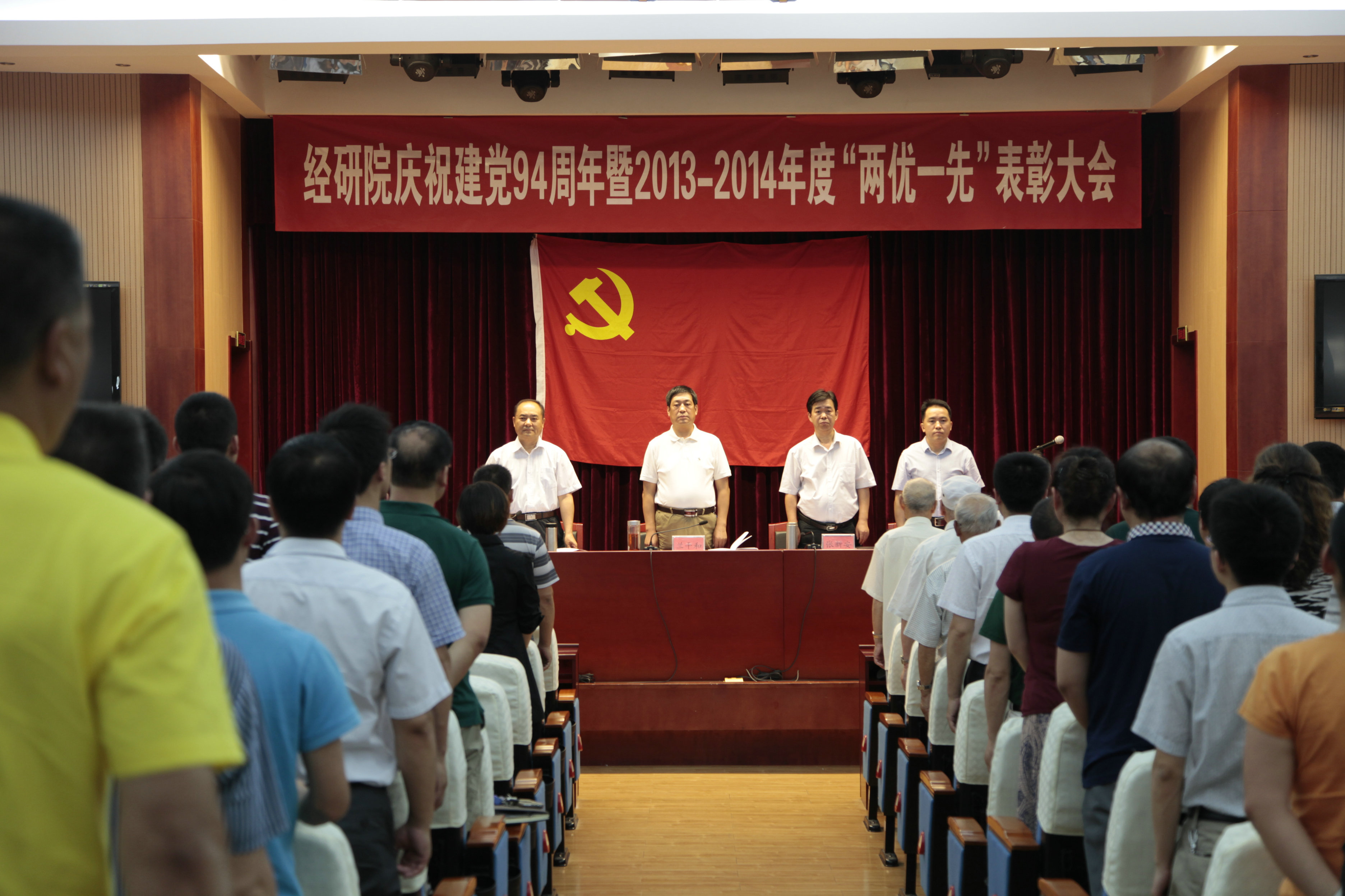 7月1日,经研院隆重召开庆祝建党94周年暨2013~2014年度“两优一先”表彰大会,新党员进行了入党誓、老党员重温了入党誓词,表彰了“两优一先”,观看了影片《焦裕禄》?;嵋橛杉臀榧谴薏ㄖ鞒?,全体在职职工、离退休党支部支委、部分离退休党员参加了会议。