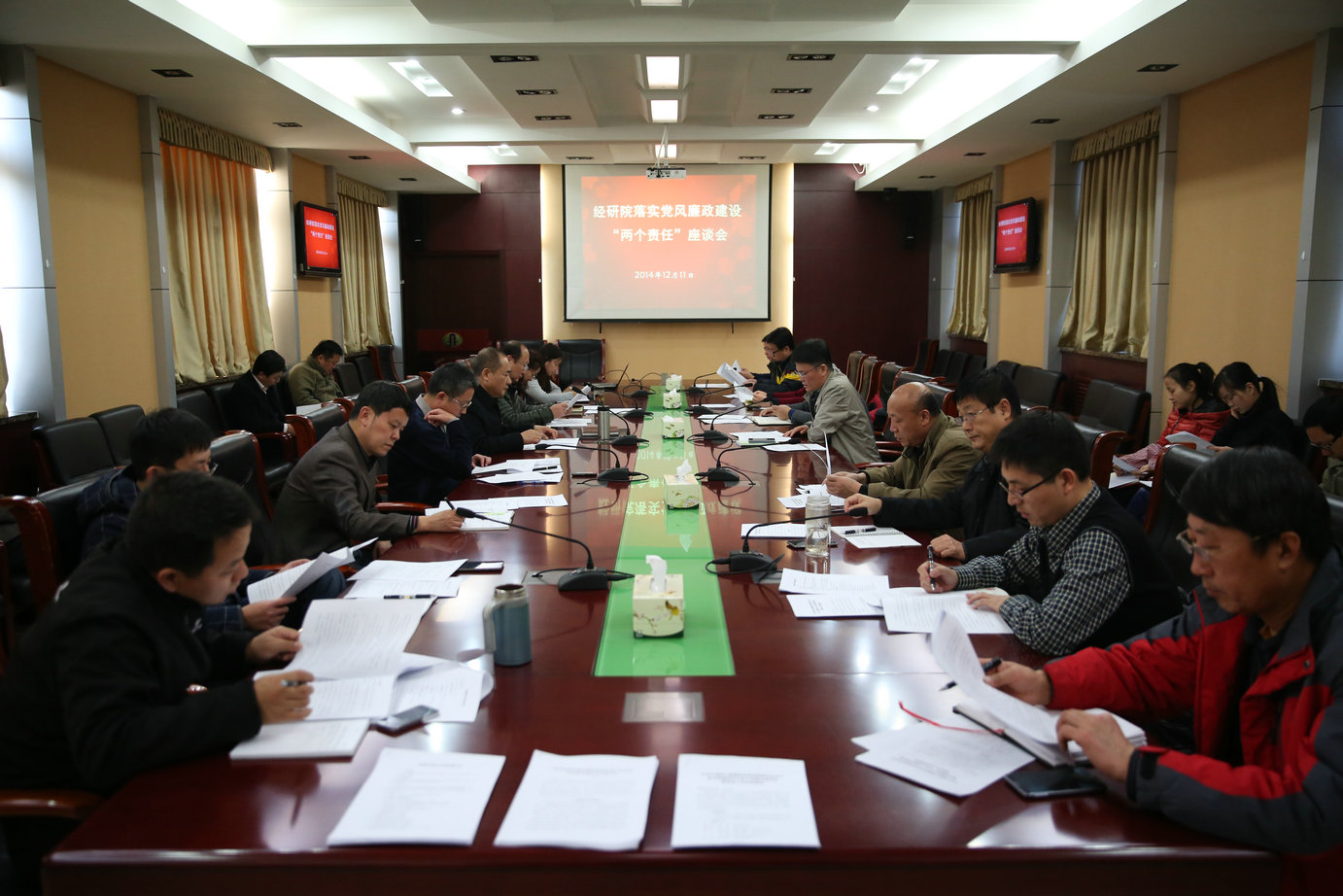 为深入贯彻落实部党组关于落实党风廉政党委主体责任和纪委监督责任的要求,12月11日,院召开了落实党风廉政建设“两个责任”座谈会,重点围绕细化党支部、各单位层面的主体责任,如何更好落实“两个责任”进行讨论?;嵋榫汀对旱澄赜诼涫档撤缌ㄉ璧澄魈逶鹑魏图臀喽皆鹑蔚氖凳┓桨浮?、《经研院在职党支部设置调整方案》、《关于成立贯彻执行中央八项规定精神情况监督检查工作组的通知》等文件征求各党支部、各单位的意见和建议?;嵋橛稍杭臀榧谴薏ㄍ局鞒?,各党支部书记、纪检委员和各单位负责人参加会议。