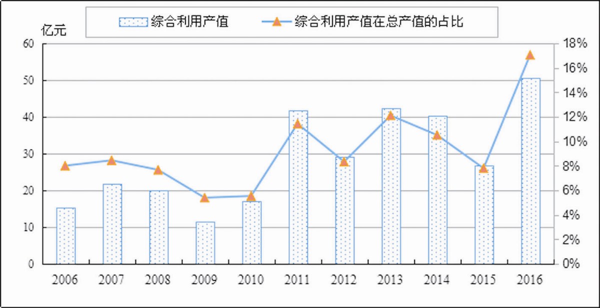 合理利用二次资源,在增加循环利用产品有效供给的同时促进了矿业领域生态文明建设。废弃物和再生金属的回收利用,可节约能源,大大减少原矿资源消耗,降低环境扰动,是资源循环利用的重要环节。2016年,我国尾矿产生量为16.03亿吨,同比基本持平,其中85%由铁、铜、金尾矿组成,在尾矿排放量变化不大的同时,利用率逐年提升。2009~2016年,尾矿利用率从12%增加到22%左右。